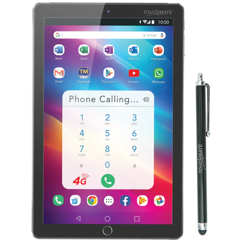 TOUCHMATE 10.1” 4G Calling Tablet. Users can enjoy 4G super high-speed wireless internet & phone calling anywhere on the move. It contains a fast 1.6 GHz Octa-Core high-speed processor for quick internet access at home, office, or outdoor. Built-in GPS for map & navigation that can be used in vehicles. It runs on Google's latest Android 11 operating system.